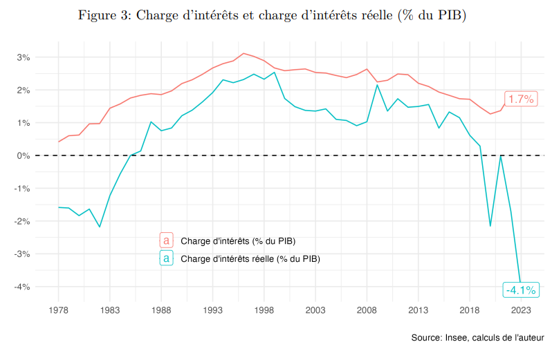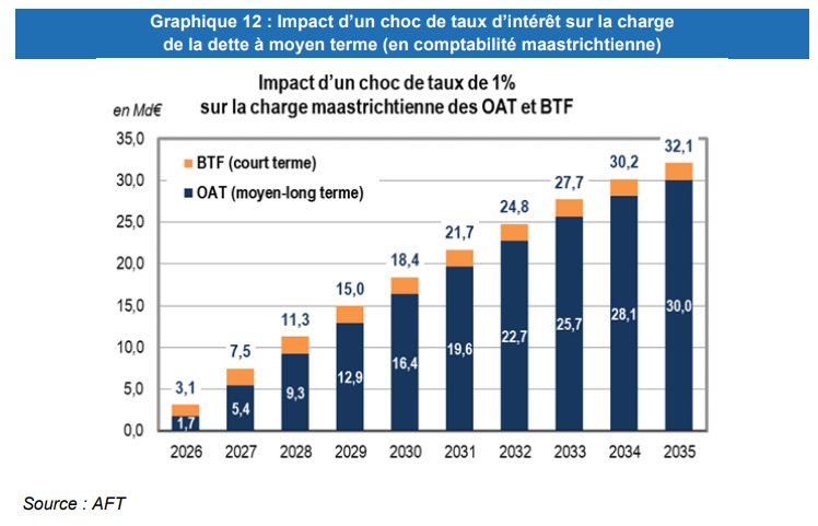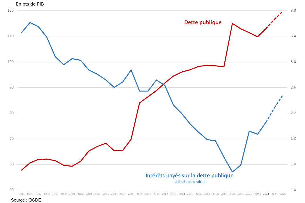 Si jusqu'ici, selon le Conseil d'analyse économique, la dette publique s'explique par l'addition des déficits publics passés plutôt que par la charge de la dette, celle-ci devrait rapidement contribuer elle aussi à la dynamique de la dette, et de façon substantielle. La trajectoire de hausse des taux d'intérêt réels et de hausse du stock de dette émis par la France augmente considérabement ce risque.