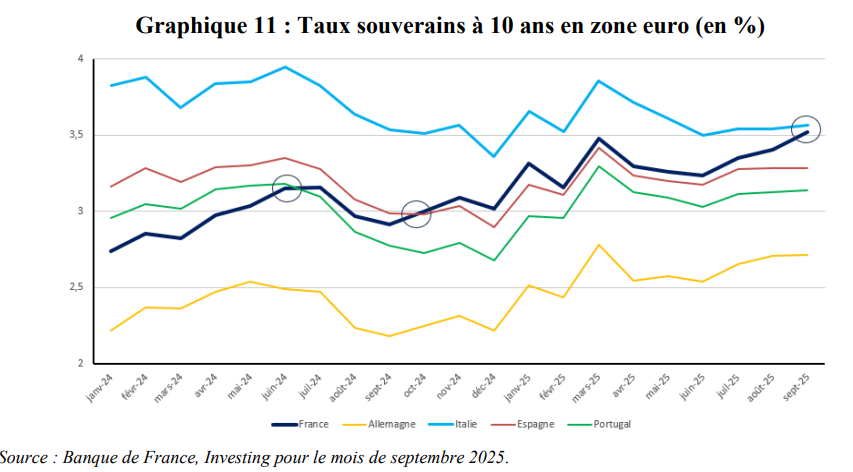 Par ailleurs, comme évoqué, les taux souverains des pays du Sud de l'Europe sont successivement devenus inférieurs à ceux de la France, signe que les obligations de ces pays sont jugées plus sûres et peuvent, dès lors, être préférées à celles de la France.