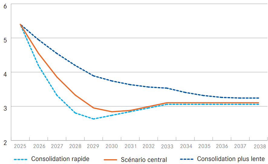 Plusieurs prévisionnistes tablent même sur un déficit public encore plus dégradé, compte tenu de l'absence de majorité à l'Assemblée nationale pour la coalition qui dirige l'exécutif. Des investisseurs, tels qu'Alexandre Stott, de la banque Goldman Sachs « tablent plutôt sur un déficit encore proche de 5 % du PIB en 2026, en baisse, mais légère, par rapport à cette année97(*) ». Le Fonds monétaire va encore plus loin puisqu'il anticipe 5,8 % de déficit public en 202698(*).