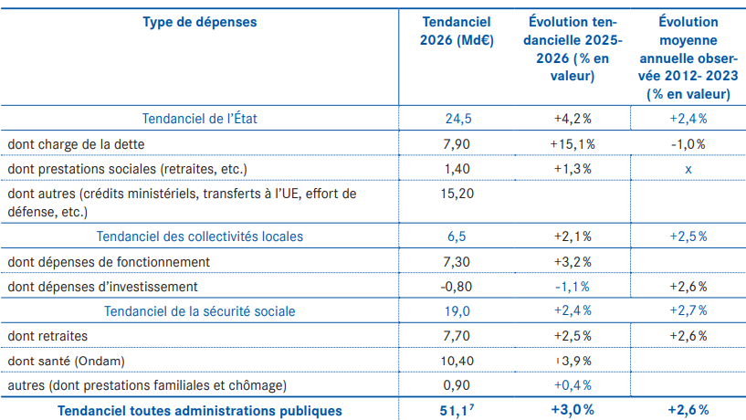 Ainsi, le tendanciel des dépenses de + 3 % calculé par le Gouvernement entre 2025 et 2026 repose sur les hypothèses suivantes.