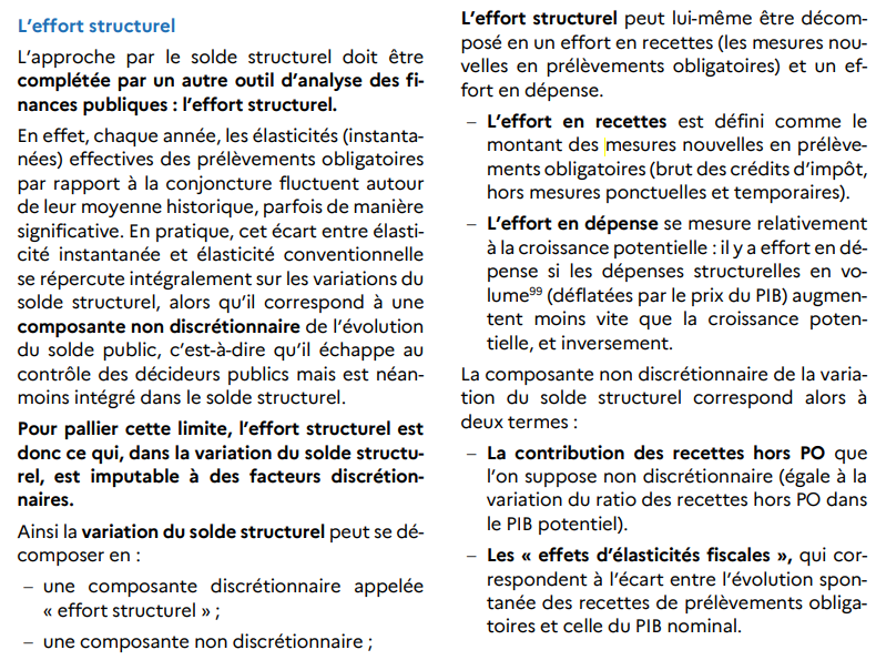 Dit autrement, le solde public reflète assez mal les intentions et réalisations du Gouvernement et demeure assez largement indépendant de l'effort structurel fourni par la France. C'est la raison pour laquelle la notion de « trajectoire de dépenses nettes » ou d'« ajustement structurel » sont préférées.
