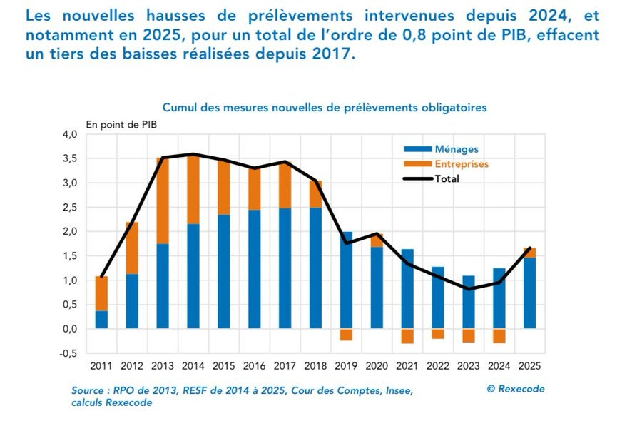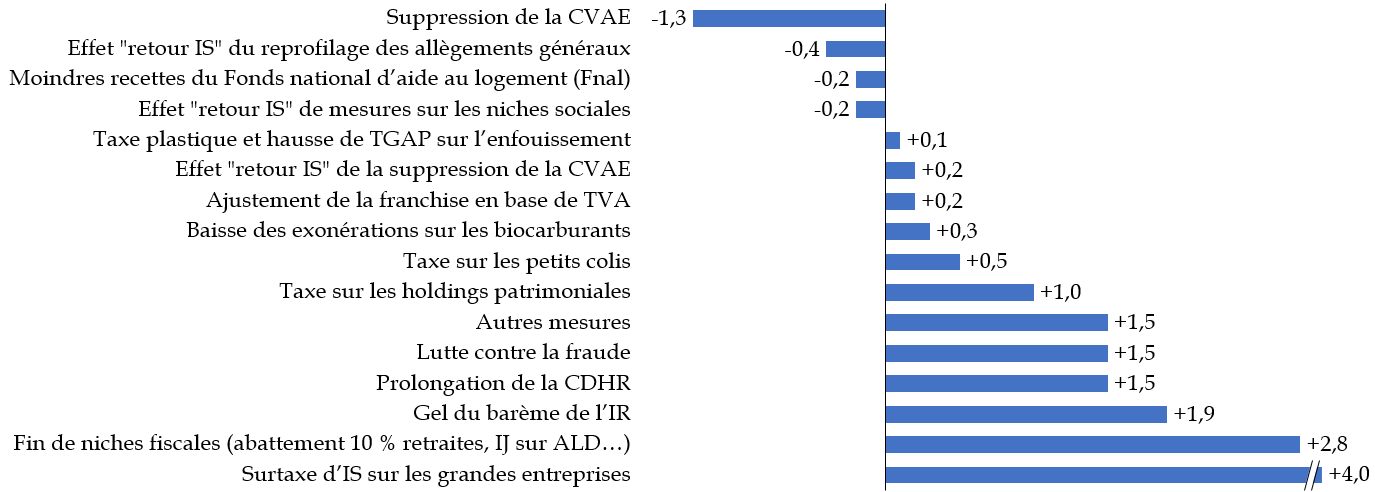 Ainsi, en 2026, l'effort proviendrait majoritairement de moindres dépenses, pour environ 17 Md€, complété par les hausses de prélèvements obligatoires, pour près de 14 Md€.