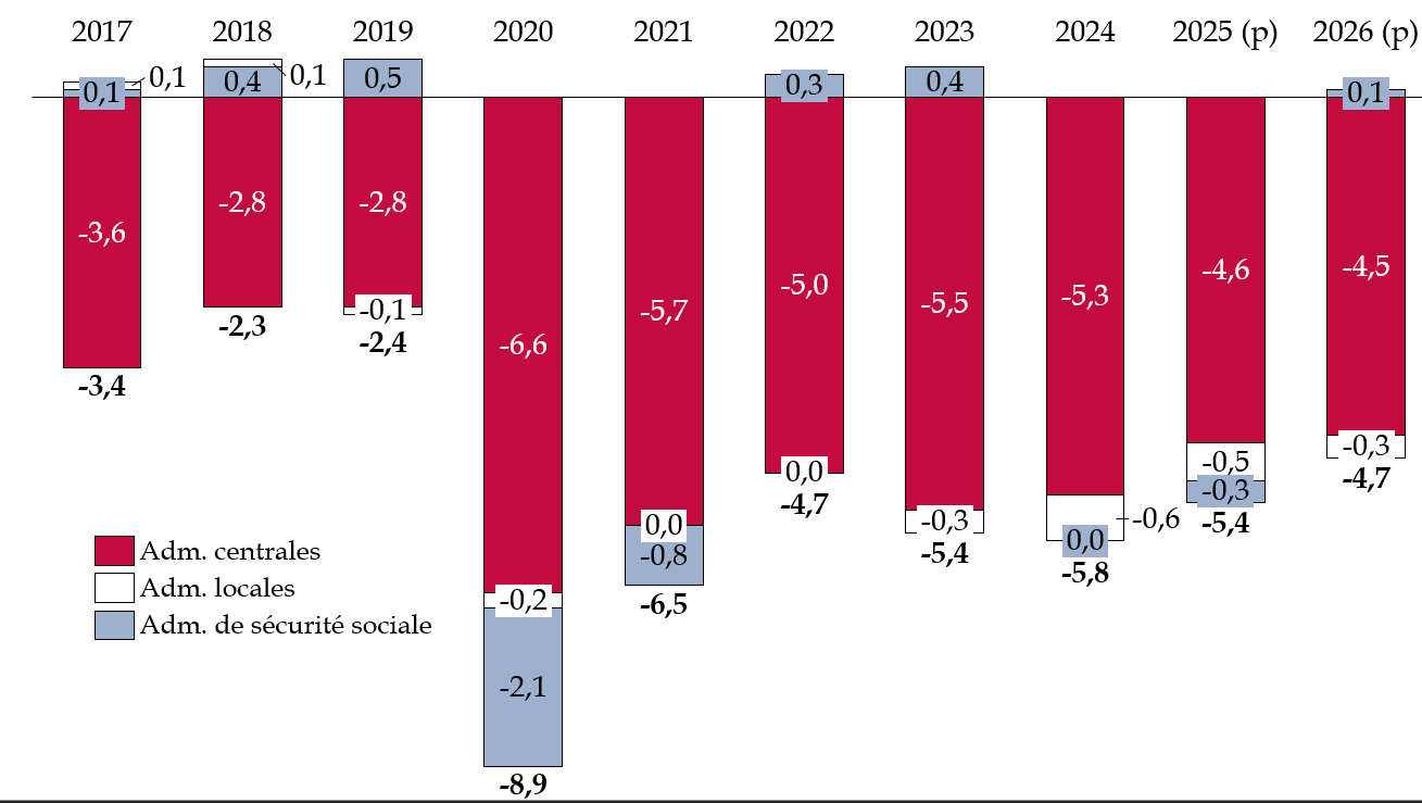 Pour l'année 2026 encore, le secteur des administrations publiques centrales - au sens large, incluant l'État et les organismes divers d'administration centrale - serait de nouveau le contributeur quasi exclusif au déficit des administrations publiques, avec 4,5 points sur 4,7 % de déficit public toutes administrations publiques confondues. Par comparaison, les administrations publiques locales n'y contribueraient qu'à hauteur de 0,3 point tandis que les administrations de sécurité sociale seraient légèrement excédentaires, à hauteur de 0,1 point.