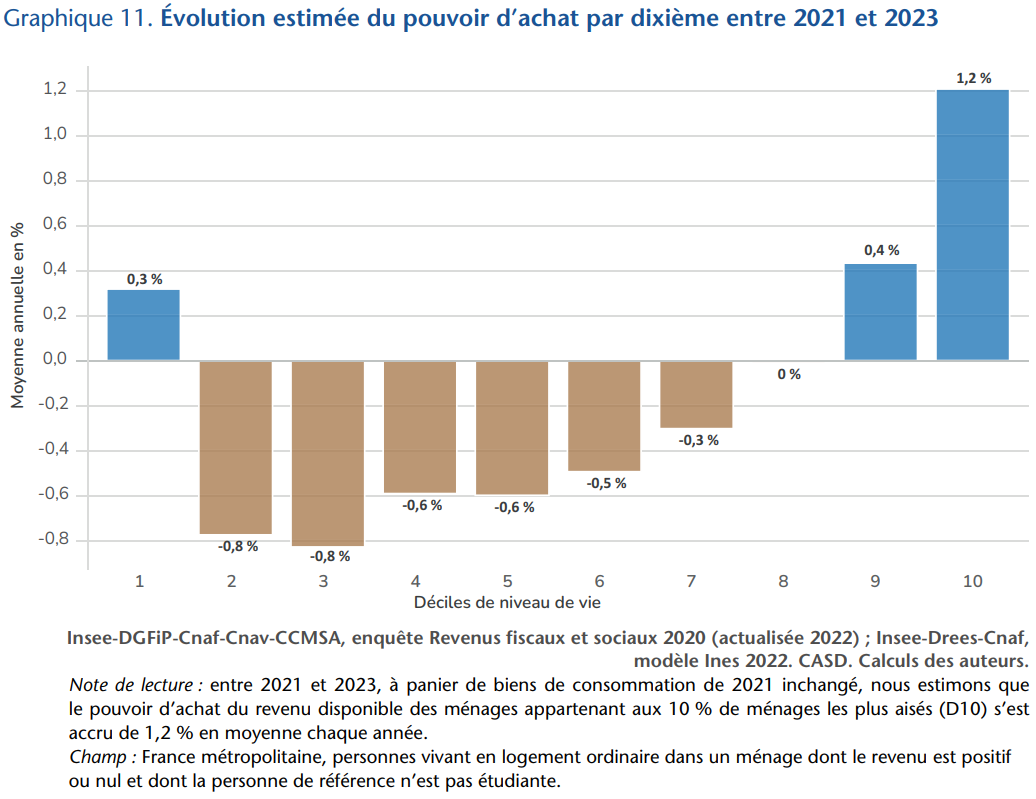 Ce graphique montre que le premier décile (D1) a vu son pouvoir d'achat augmenter légèrement (+ 0,3 % par an), soutenu par les indexations des minimas sociaux sur l'inflation, et que les deux derniers déciles (D9 et surtout D10) ont bénéficié de hausses de pouvoir d'achat plus importantes encore (respectivement + 0,4 % et 1,2 %), en lien avec des revenus, notamment du capital, dynamiques. Le fait marquant est que l'évolution du pouvoir d'achat par décile est très hétérogène : celui du décile D8 a, lui, stagné, tandis que 60 % des ménages (déciles D2 à D7) ont enregistré dans la période une baisse de pouvoir d'achat, allant de - 0,3 % par an pour le décile D7 à - 0,8 % par an pour les déciles D2 et D3.
