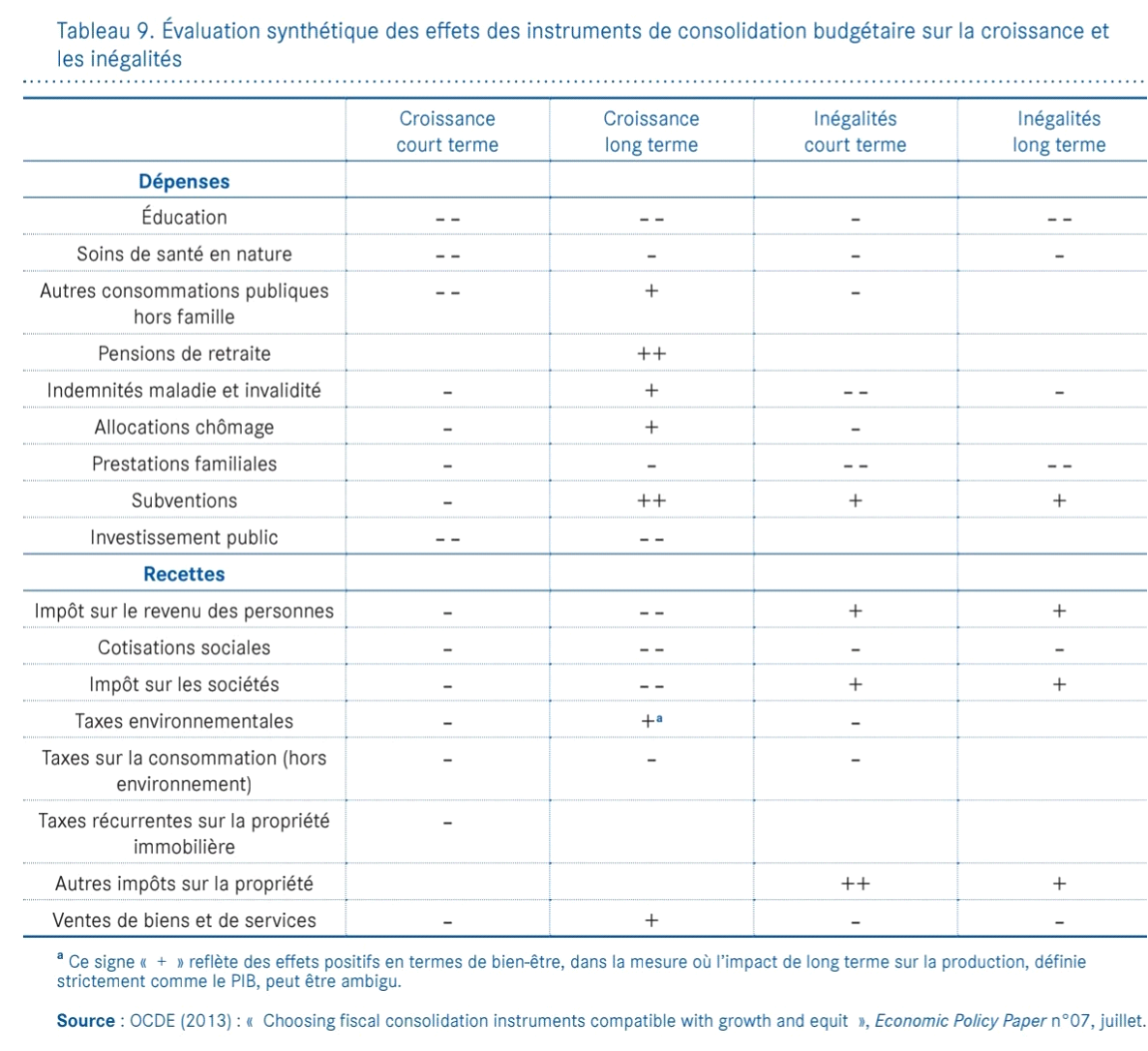 Le Conseil d'analyse économique, par exemple, reprend une classification proposée par l'OCDE, selon laquelle une baisse des dépenses d'éducation serait particulièrement pénalisante pour la croissance à court terme comme à long terme, et pour les inégalités à long terme ; à long terme, selon cette analyse, une baisse des pensions de retraites serait très favorable à la croissance de long terme. Pour l'OCDE, une hausse de l'impôt sur les sociétés serait négative pour la croissance à court terme, et plus encore à long terme, mais réduirait les inégalités à court comme à long terme.