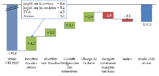 Le déficit budgétaire pour l'année courante 2025, désormais prévu à un niveau de 130,5 milliards d'euros (solde révisé124(*)), serait inférieur de 8,5 milliards d'euros à celui prévu en loi de finances initiale (139,0 milliards d'euros)125(*).