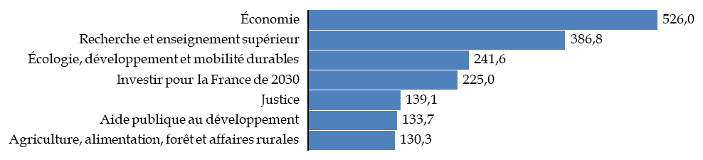 Ce décret a porté sur 78 programmes budgétaires, dont 74 des 136 programmes du budget général131(*). Les annulations ont concerné en premier lieu les missions « Économie » (526,0 M€, portant sur le programme 367 relatif aux participations financières de l'État, qui sera présenté infra), « Recherche et enseignement supérieur » (386,8 M€), « Écologie, développement et mobilité durables » (241,6 M€) et « Investir pour la France de 2030 » (225,0 M€).