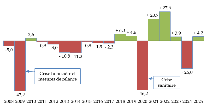 Avec une amélioration du solde en cours d'exercice, l'année 2025 se distinguerait par ailleurs des années précédentes, qui avaient toutes, depuis cinq ans, connu un déficit supérieur, voire très supérieur en exécution à celui présenté dans le projet de loi de finances initiale : le dépassement avait atteint 85,0 milliards d'euros en 2020, année du déclenchement de la crise sanitaire, de 17,9 milliards d'euros en 2021, de 8,1 milliards d'euros en 2022, de 14,5 milliards d'euros en 2023 et de 9,0 milliards d'euros en 2024.