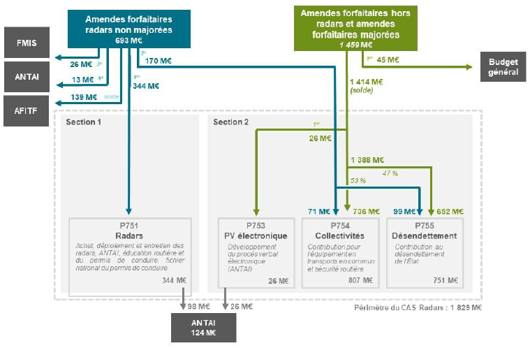 - le programme 754 (« Contribution à l'équipement des collectivités territoriales pour l'amélioration des transports en commun, de la sécurité et de la circulation routières »), qui reverse aux collectivités territoriales une partie des recettes des amendes encaissées par l'État ;