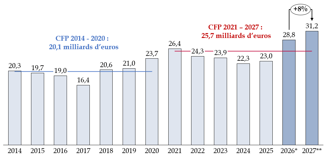 Dans l'absolu, le niveau élevé de la contribution française ne fait que refléter le niveau de financement convenu dans le CFP 2021-2027. Pour la France, ceci traduit une hausse du montant annuel moyen du PSR-UE, qui passe, en euros courants, de 20,1 milliards d'euros pour le CFP 2014-2020 à 25,7 milliards d'euros pour le CFP 2021-2027 (+ 28 %). Cette hausse reflète une progression en euros courants entre le CFP 2014-2020 (1,064 milliards d'euros) et le CFP 2021-2027 (1,215 milliards d'euros, (soit une hausse de 14 %), à laquelle il convient d'ajouter les 21,0 milliards d'euros de dépenses nouvelles issus de la révision du CFP de 2024.