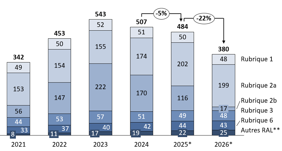 Note : * PLF 2026 ; ** estimation de la direction du budget