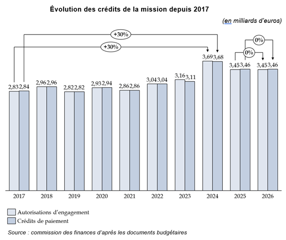 Aucune création d'ETP n'est prévue pour l'année 2026. Toutefois, l'extension en année pleine du schéma d'emplois 2025 sur 2026, avec la création de 75 nouveaux ETP, aura un impact budgétaire de l'ordre de 4,26 millions d'euros. Ainsi, pour la première fois depuis 2021, le plafond d'emplois de la mission demeure stable : entre 2021 et 2024, le schéma d'emplois cumulé exécuté a représenté une hausse de 233 ETP.