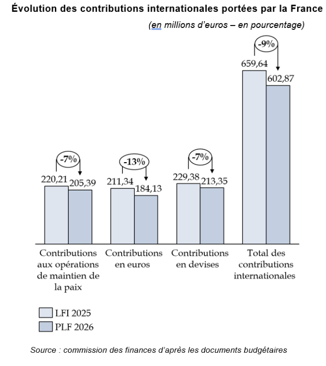 Le ministère de l'Europe et des affaires étrangères (MEAE) bénéficie de deux effets conjoncturels permettant de dégager des marges de manoeuvre budgétaires pour l'exercice 2026 : une baisse des contributions aux opérations de maintien de la paix des Nations unies (- 15 millions d'euros) et une diminution des contributions obligatoires (- 26,6 millions d'euros), d'une part, et une poursuite de la baisse du nombre d'élèves boursiers dans le réseau de l'enseignement français à l'étranger, d'autre part.