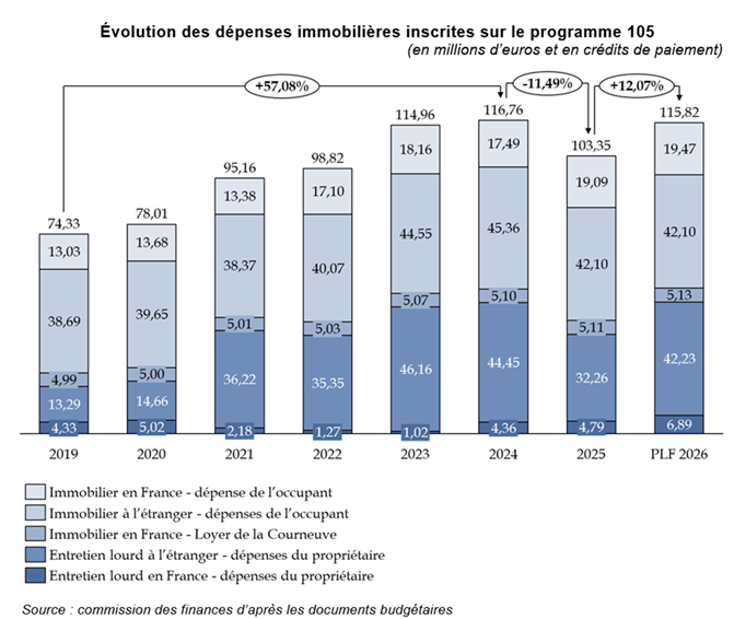 Au total, les dépenses immobilières, fonctionnement et investissement confondus, augmentent de 12,1 % par rapport à la loi de finances pour 2025. Par cette augmentation, le MEAE revient sur les mesures d'économies décidées en cours d'examen du projet de loi de finances pour 2025.