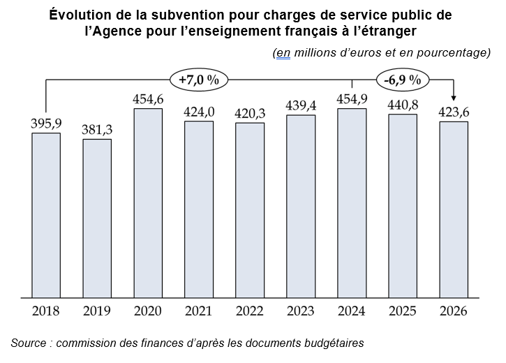 Ainsi, la subvention pour charges de service public versée à l'Agence pour l'enseignement français à l'étranger devrait s'élever à 391,64 millions d'euros en AE=CP, en baisse de 25 millions d'euros par rapport à l'exercice précédent. Un tel effort pourrait toutefois remettre en cause la soutenabilité financière de l'agence dont le modèle économique est en cours de révision.