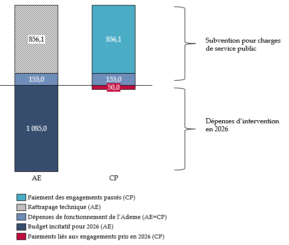 Ce changement de modalités budgétaires nécessite toutefois un rattrapage technique en AE d'un montant de 856 millions d'euros, destiné à couvrir les paiements (CP) des engagements pris avant 2026. Le solde, soit 1 237 millions d'euros, correspond aux AE consacrées aux interventions financées sur le budget incitatif de l'agence ainsi qu'à son budget de moyens (153 millions d'euros).