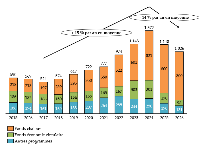 Les financements du fonds chaleur sont ceux qui ont le plus augmenté sur cette période : alors que c'était déjà la politique la mieux financée en 2017, ses crédits ont quadruplé depuis. En outre, les financements du fonds ont peu diminué depuis 2024, passant de 821 millions d'euros à 800 millions d'euros dans le budget prévisionnel pour 2026.