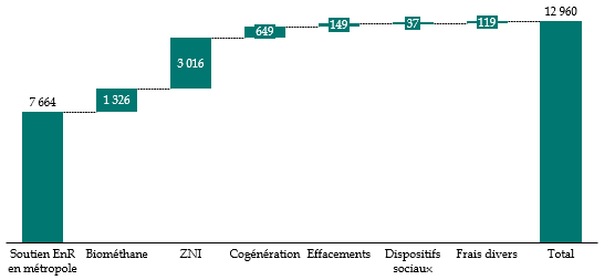 Cette augmentation s'explique principalement par la hausse du coût du soutien aux énergies renouvelables électriques en métropole continentale (voir infra) qui résulte elle-même de deux phénomènes, d'une part la baisse des prix sur les marchés de gros de l'électricité et l'augmentation des volumes d'électricité produite soutenus.