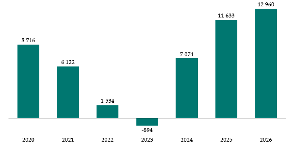 Après la période inédite en 2022 et 2023 durant laquelle les dispositifs de soutien ont généré des recettes exceptionnelles pour l'État (voir supra), depuis 2024, ces mécanismes sont redevenus une charge nette substantielle et croissante pour ce dernier. Ainsi, d'après les prévisions de la CRE, leur coût pour l'État devrait-il progresser de 4,8 milliards d'euros entre 2024 et 2026 (+ 164 %) pour s'établir à 7,7 milliards d'euros au titre de ce dernier exercice.