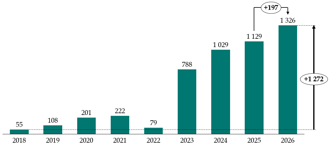 D'après le projet annuel de performances pour 2026 du programme 345, cette augmentation extrêmement significative s'explique principalement par le développement de la filière et l'augmentation des volumes de biométhane soutenus. En effet, alors qu'en 2018, 73 unités de méthanisation injectaient du biométhane dans les réseaux de gaz naturel, pour une capacité raccordée de 1,5 TWh par an, au 31 mars 2025, 753 installations de production de biométhane sont raccordées aux réseaux de transport et de distribution, pour une capacité cumulée de 14,3 TWh par an.