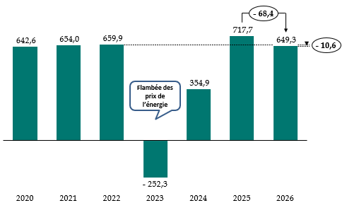 D'après la CRE, en 2026, les charges relatives au soutien à la cogénération pourraient s'élever à 649 millions d'euros, en baisse de 68 millions d'euros par rapport à l'année précédente et de 10 millions d'euros par rapport à la situation qui prévalait en 2022, avant que les effets de la crise des prix de l'énergie ne se répercutent sur les CSPE.