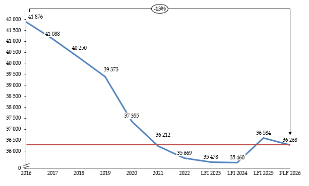 En 2026, le plafond d'emploi de la mission s'élèverait à 36 268 ETPT, contre 36 584 ETPT en 2025. Cette hausse par rapport aux années 2021-2024 s'explique uniquement par le transfert l'année dernière des emplois de l'IRSN de la mission « Recherche et enseignement supérieur » à la mission « Écologie » dans le contexte de la création de l'Autorité de sûreté nucléaire et de radioprotection.