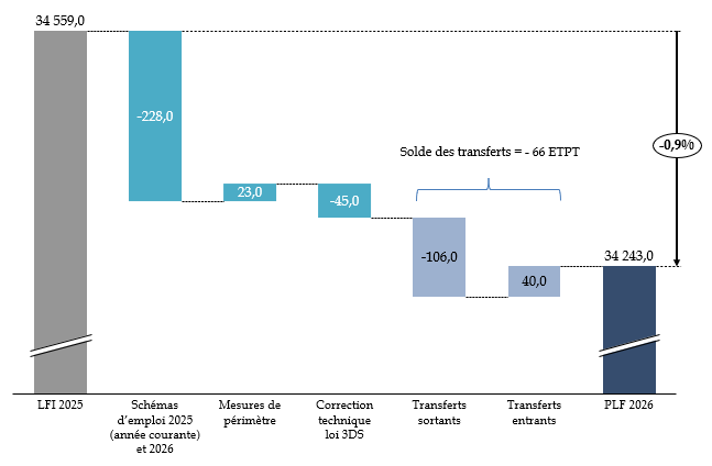 Cette diminution s'explique principalement par l'impact négatif des schémas d'emplois 2025 et 2026, à hauteur de - 228 ETPT, par le solde négatif des transferts (- 66 ETPT) et enfin par une correction technique (- 45 ETPT).