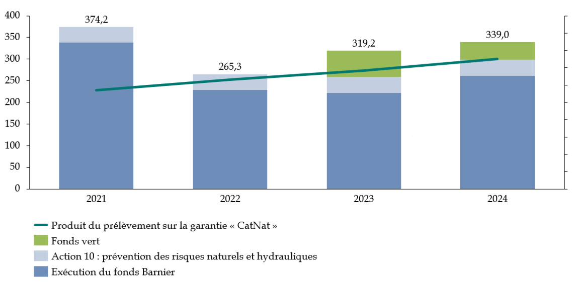 Lorsque l'on agrège les dépenses spécifiques pour les catastrophes naturelles qui relèvent du régime « CatNat », alors la somme des dépenses correspond au montant sur le prélèvement de la garantie des contrats d'assurance. Toutefois, faute de ventilation a priori du fonds Barnier et du fonds vert, il n'est possible d'établir des chiffres précis que jusqu'en 2024.