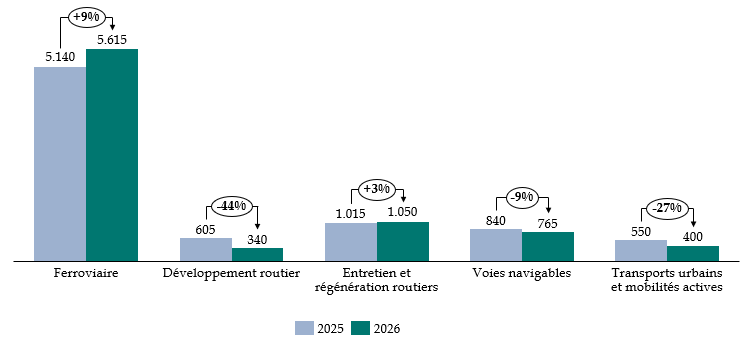 Dans le détail, les dépenses consacrées au secteur ferroviaire progresseraient de plus de 400 millions d'euros, soit un rythme significativement supérieur à l'inflation. Les dépenses relatives à l'entretien et à la régénération du réseau routier national non concédé progresseraient également à un rythme supérieur à l'inflation. Inversement, les dépenses pour des projets de développement de nouvelles infrastructures routières ou encore en faveur des transports en communs urbains19(*) et des mobilités actives connaîtraient des diminutions significatives20(*). Dépendants notamment de l'obtention de fonds européens, les dépenses totales dans les infrastructures fluviales pourraient diminuer en 2026. Néanmoins, la subvention versée par le budget de l'État à VNF ainsi que les sommes consacrées au secteur par l'AFITF devraient rester stables en 2026.