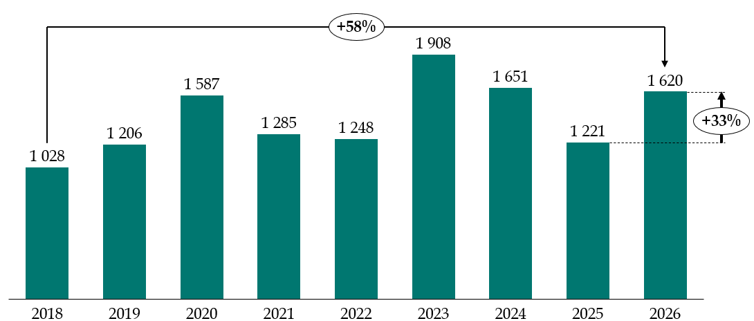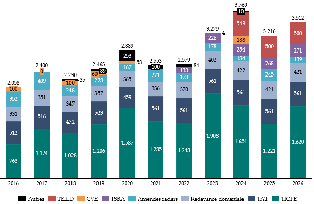 Le présent projet de loi de finances prévoit quant à lui en 2026 une inversion de cette tendance baissière en portant ce plafond à 1 620 millions d'euros, soit une augmentation de 33 % par rapport à 2025 et un niveau équivalent à celui constaté en 2020 et en 2024. Certes en baisse par rapport au pic constaté en 2023, sur une période plus longue, le montant d'accise affecté à l'AFITF reste orienté sur une tendance haussière depuis la promulgation de la loi d'orientation des mobilités (+ 58 % depuis 2018).
