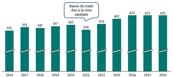 Assis sur le chiffre d'affaires de l'année précédente, le produit de la redevance domaniale versée par les sociétés concessionnaires d'autoroutes (SCA) s'est établi à 411 millions d'euros en 2024. Le rendement de la redevance pourrait atteindre 421 millions d'euros en 2025. Le même niveau de rendement est attendu en 2026.