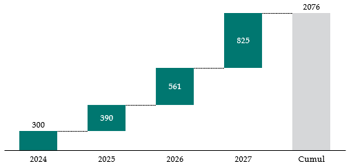À la demande de l'État, pour la période 2024-2027, la SNCF s'est engagée à financer à elle seule les premières étapes de l'augmentation progressive des investissements en matière de régénération et de modernisation des infrastructures ferroviaires. Pour l'entreprise publique, cet effort prend concrètement la forme de versements complémentaires au fonds de concours par rapport à la trajectoire qui était prévue par le contrat de performance. Au total, l'effort financier consenti par la SNCF sur la période représente 2,1 milliards d'euros et doit se répartir comme décrit dans le graphique ci-après.