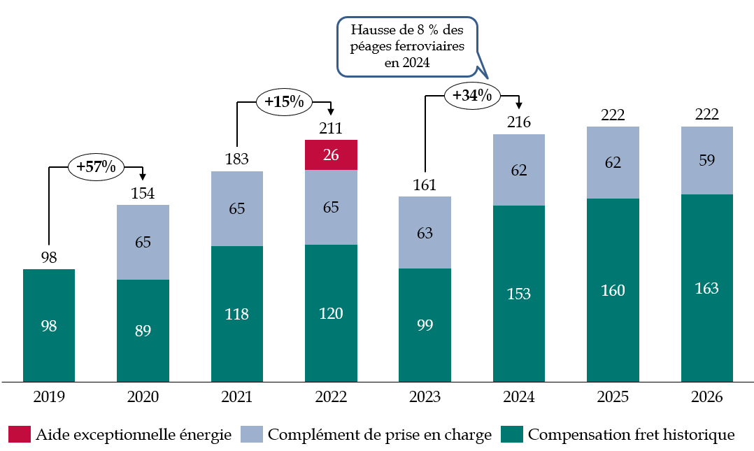 Cette dernière intègre depuis 2020, de façon complémentaire au dispositif historique, une prise en charge additionnelle des péages ferroviaires dus par les opérateurs de fret dont le montant devrait représenter 59 millions d'euros en 2026.