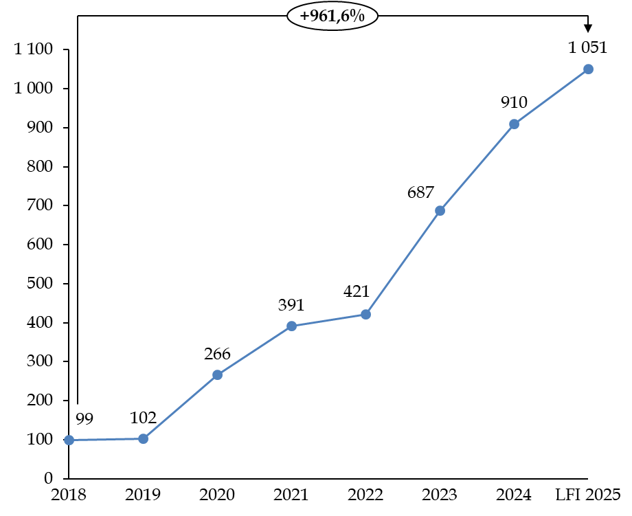 En 2026, la compensation carbone devrait s'élever à 782 millions d'euros en AE et en CP, soit un montant en baisse de 269 millions d'euros par rapport au montant inscrit en LFI 2025. L'année 2026 devrait ainsi marquer une rupture avec la trajectoire de dynamisme de cette enveloppe entre 2017 et 2025.