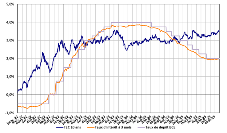 Note : données au 31 août 2025. L'indice quotidien TEC 10 ans (taux de l'échéance constante à 10 ans) représente le taux de rendement actuariel d'une OAT fictive d'échéance exactement égale à 10 ans. Le taux BTF 3 mois désigne le taux d'intérêt portant sur les bons du Trésor à taux fixe et à intérêt précompté d'une maturité de 3 mois. Le taux de dépôt BCE correspond au taux de la facilité de dépôt de la Banque centrale européenne.