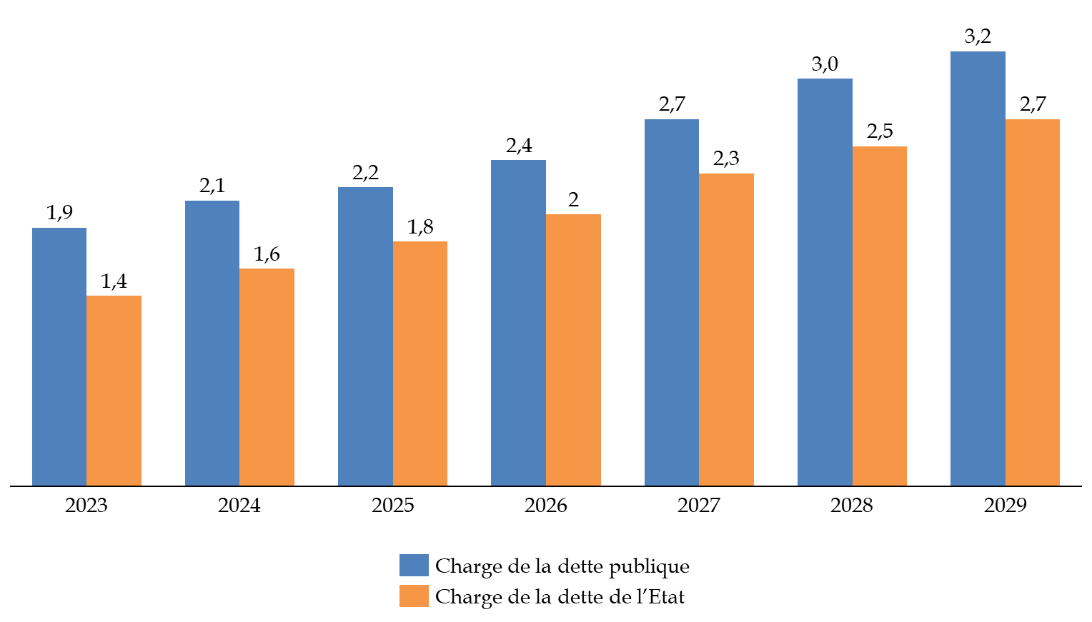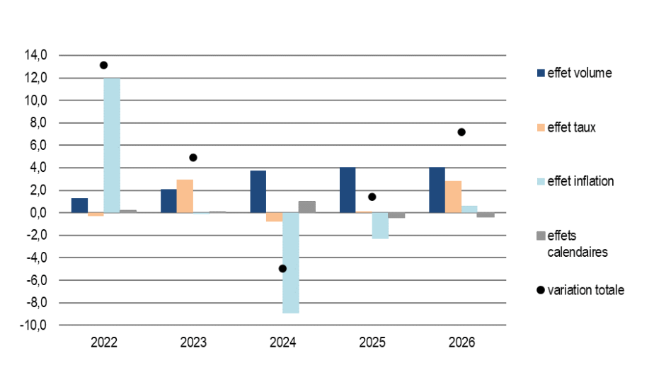 En comptabilité budgétaire, la charge de la dette de l'État devrait connaître une croissance soutenue de + 7,49 % en 2026, à 58,0 milliards d'euros, contre 53,5 milliards d'euros en loi de finances initiale pour 2025, soit une augmentation de + 4,5 milliards d'euros. En comptabilité générale, la charge de la dette de l'État devrait s'élever à 60,4 milliards d'euros en 2026, soit une augmentation de + 8 milliards d'euros par rapport à 2025. Ainsi, la charge de la dette de l'État pourrait à terme, à politique budgétaire inchangée, atteindre la barre des 100 milliards d'euros.