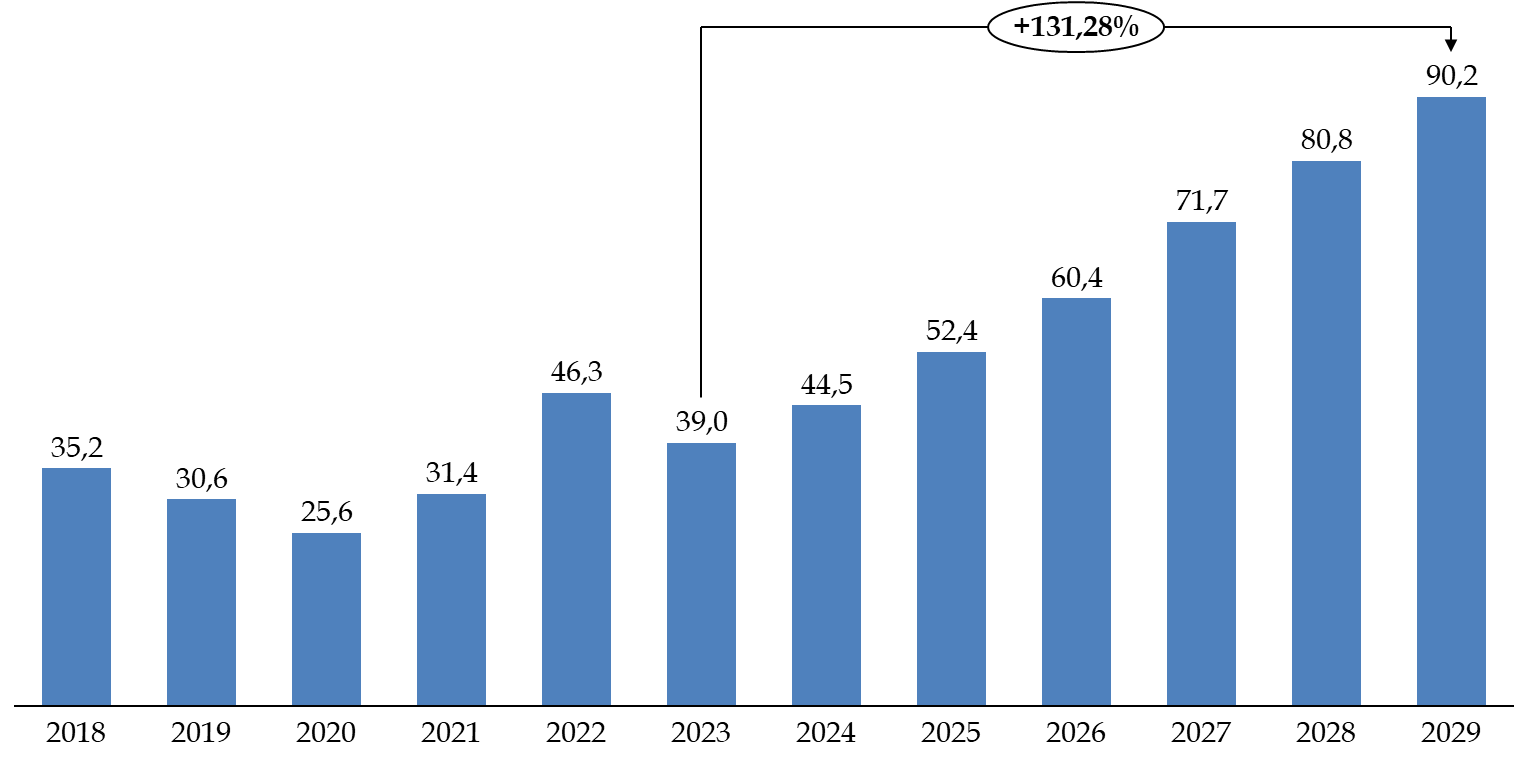 Note : les données indiquées pour les années 2025 à 2029 sont des prévisions.