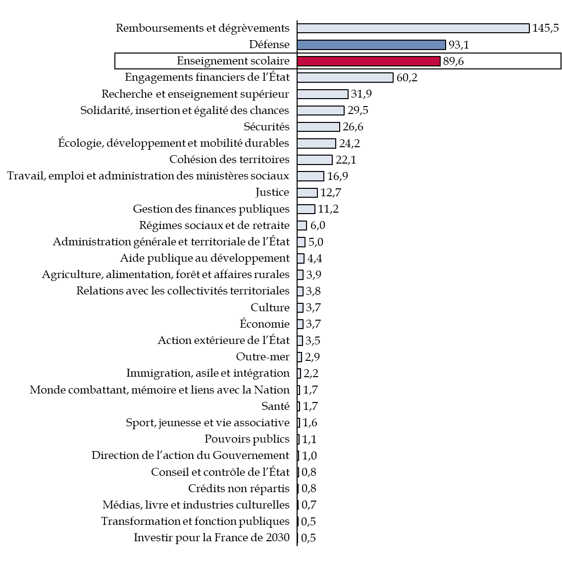 Les crédits de la mission « Enseignement scolaire » constituent pour la première fois le deuxième poste de dépenses du budget général de l'État en autorisations d'engagement, hors remboursements et dégrèvements. Le budget de la mission « Défense » représente en effet le premier budget de l'État dans le projet de loi de finances (PLF) pour 2026, même si ce n'est pas encore le cas en crédits de paiement. Une telle situation est probablement amenée à se prolonger dans les années à venir, et illustre un changement dans les priorités de la nation.