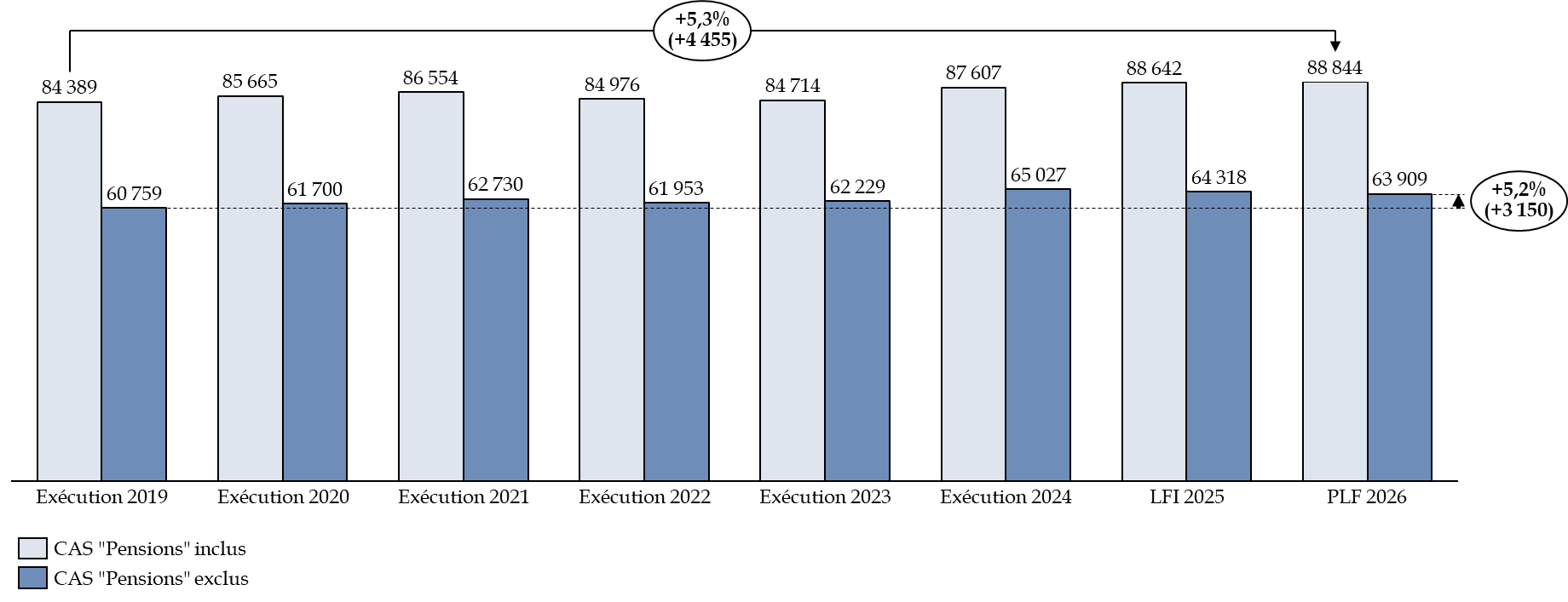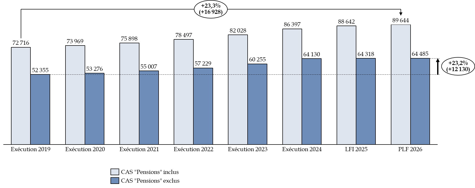 Hors CAS « Pensions », les crédits de la mission « Enseignement scolaire » ont subi une hausse de 23,1 %, soit + 12,1 milliards d'euros en 2026 par rapport à 2019, en CP. En incluant les retraites, les dépenses de la mission ont progressé de 16,9 milliards d'euros en sept ans. Cette hausse a été portée par l'augmentation des dépenses de personnel du fait des mesures salariales qui seront détaillées infra.
