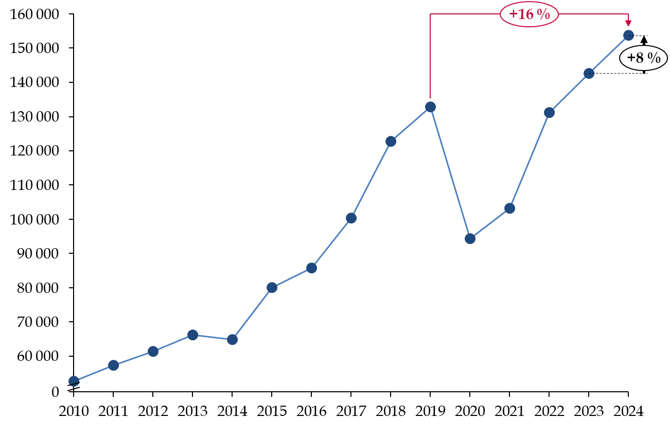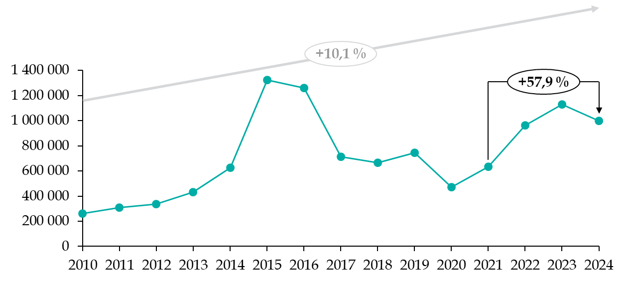 S'agissant de l'asile, près d'un million de demandes ont été enregistrées en 2024 dans l'Union européenne5(*) (UE), soit une baisse de 10 % par rapport à 2023. Toutefois, ce niveau représente une augmentation de près de 60 % par rapport à 2021, un niveau très proche des records historiques observés à l'occasion de la « crise migratoire » des années 2015 et 2016. Depuis 2010, les demandes d'asile progressent de plus de 10 % par an dans tous les pays européens.