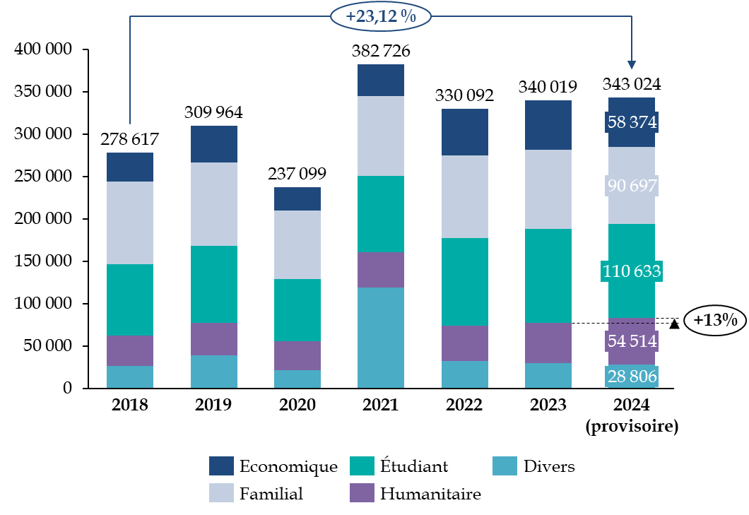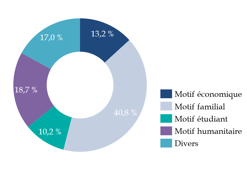 Depuis 2018, le nombre des primo-délivrances de titres de séjour a augmenté de plus de 23 %. Sur cette période, ce sont les titres de séjour pour motif économique qui ont le plus augmenté en proportion sur la période (+ 69 %), devant le motif humanitaire (+ 53 %), et étudiant (+ 32 %). Les titres de séjour pour motif divers ont diminué (- 8,3), de même que ceux délivrés pour motif familial, qui se sont réduits de - 7,2 %. En 2024, le motif étudiant (32,3 %) est le plus fréquent, devant le motif familial (26,4 %), économique (17 %), humanitaire (15,8 %) et divers (8,3 %).