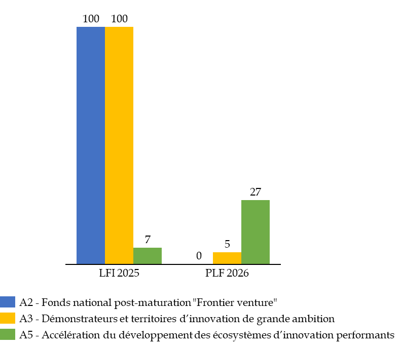 En premier lieu, l'action « Fonds national post-maturation « Frontier venture » », piloté par Bpifrance40(*), dispose d'un budget pluriannuel de 500 millions d'euros. Elle finance les interventions du fonds d'investissement direct « French Tech Seed » créé en juin 2018 par Bpifrance et qui intervient comme co-investisseur pour consolider les levées de fonds des jeunes entreprises à forte intensité technologiques. Au regard des besoins de décaissement de Bpifrance, l'ouverture d'aucun crédit de paiement (CP) n'est demandée sur cette action pour l'exercice 2026. Les rapporteurs relèvent par surcroît que la documentation budgétaire fait apparaître que les investissements correspondant à cette action sont désormais couverts par les crédits du programme 42441(*).