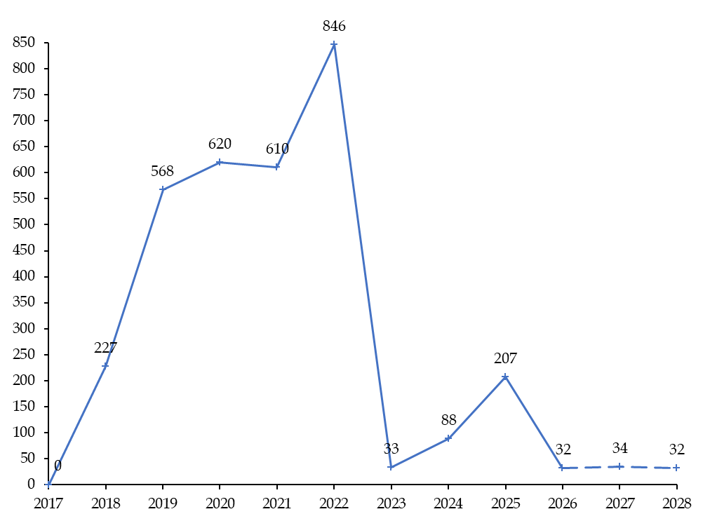 D'après les prévisions transmises aux rapporteurs par le SGPI, les crédits ouverts annuellement pour la mise en oeuvre du programme 422 jusqu'en 2028 devraient atteindre des montants annuels limités et systématiquement inférieurs à 40 millions d'euros.