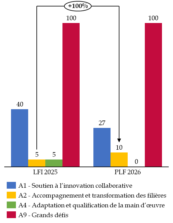En premier lieu, l'action « Soutien à l'innovation collaborative », piloté par Bpifrance48(*), dispose d'un budget pluriannuel de 600 millions d'euros. Elle a pour objet de financer des projets de recherche et développement (R&D) conduits en collaboration par des acteurs industriels et des acteurs de la recherche. Les projets soutenus, d'un coût au moins égal à 4 millions d'euros, ont pour effet à moyen terme de renforcer la collaboration entre les acteurs industriels et ceux de la recherche au service de la structuration des filières. Au regard des besoins de décaissement de Bpifrance, le montant de CP proposé en 2026 est de 27 millions d'euros.