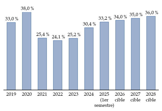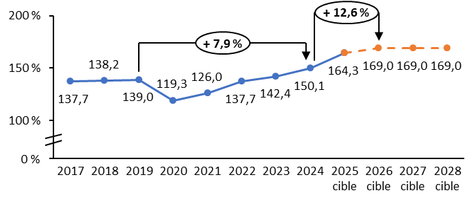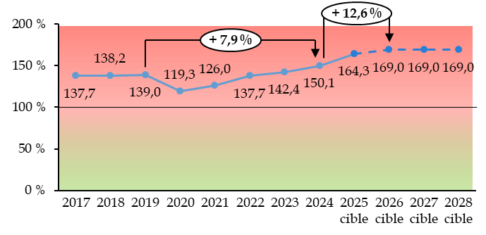 * 28 Le taux de contribution employeur au titre des personnels civils doit augmenter de 4 points et atteindre 82,28 % à partir de 2026, afin de maintenir un solde cumulé positif du CAS Pensions.