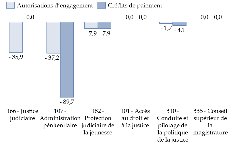 Comme en 2024, l'exécution budgétaire de la mission « Justice » a été marquée par la prise d'un décret d'annulation le 25 avril dernier (139,1 millions d'euros en crédits de paiement, dont la moitié sur le programme 166 « Justice judiciaire »). Les annulations ont porté sur une partie de la réserve de précaution, qui a toutefois été reconstituée par des blocages supplémentaires de crédits.