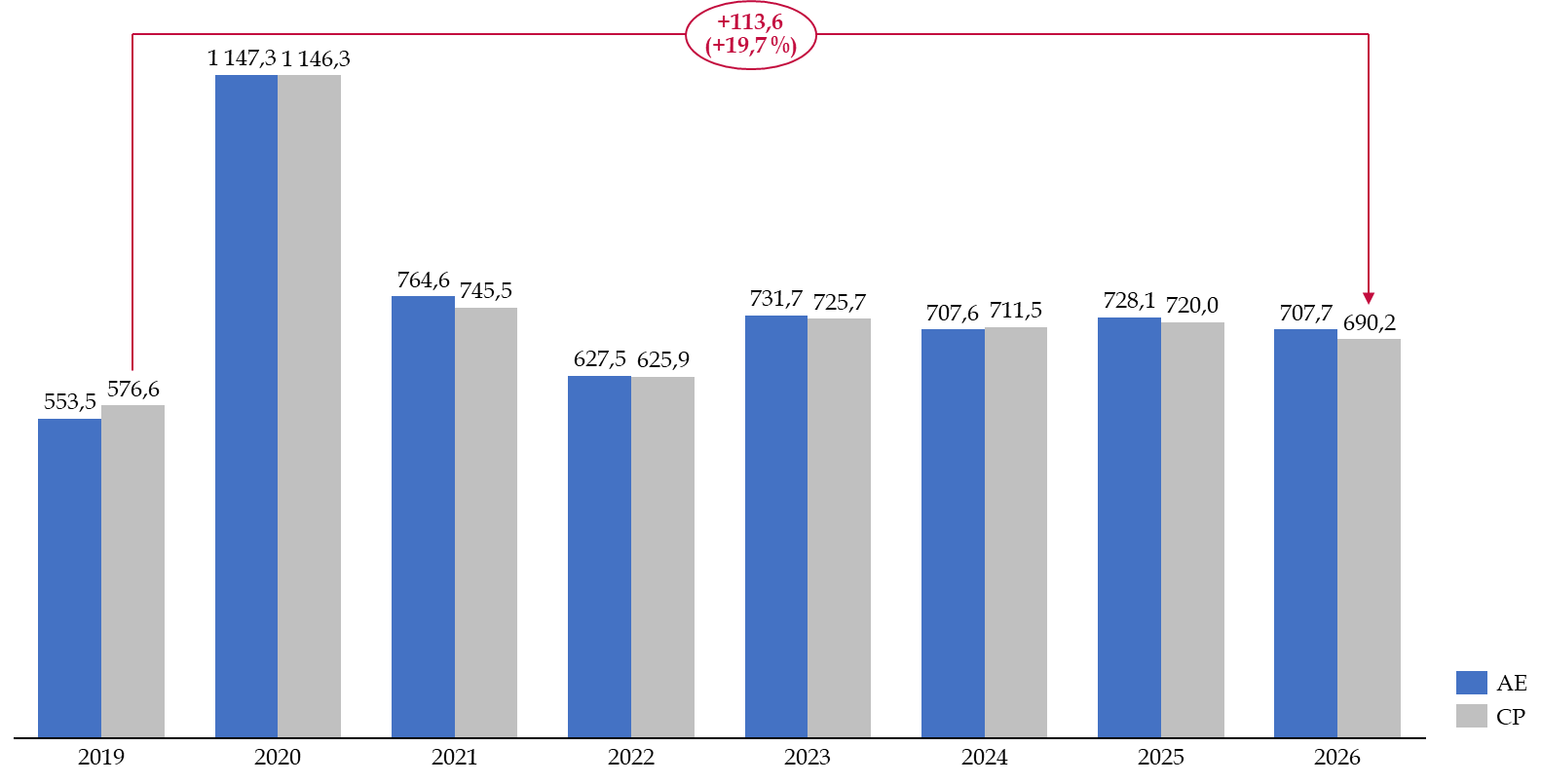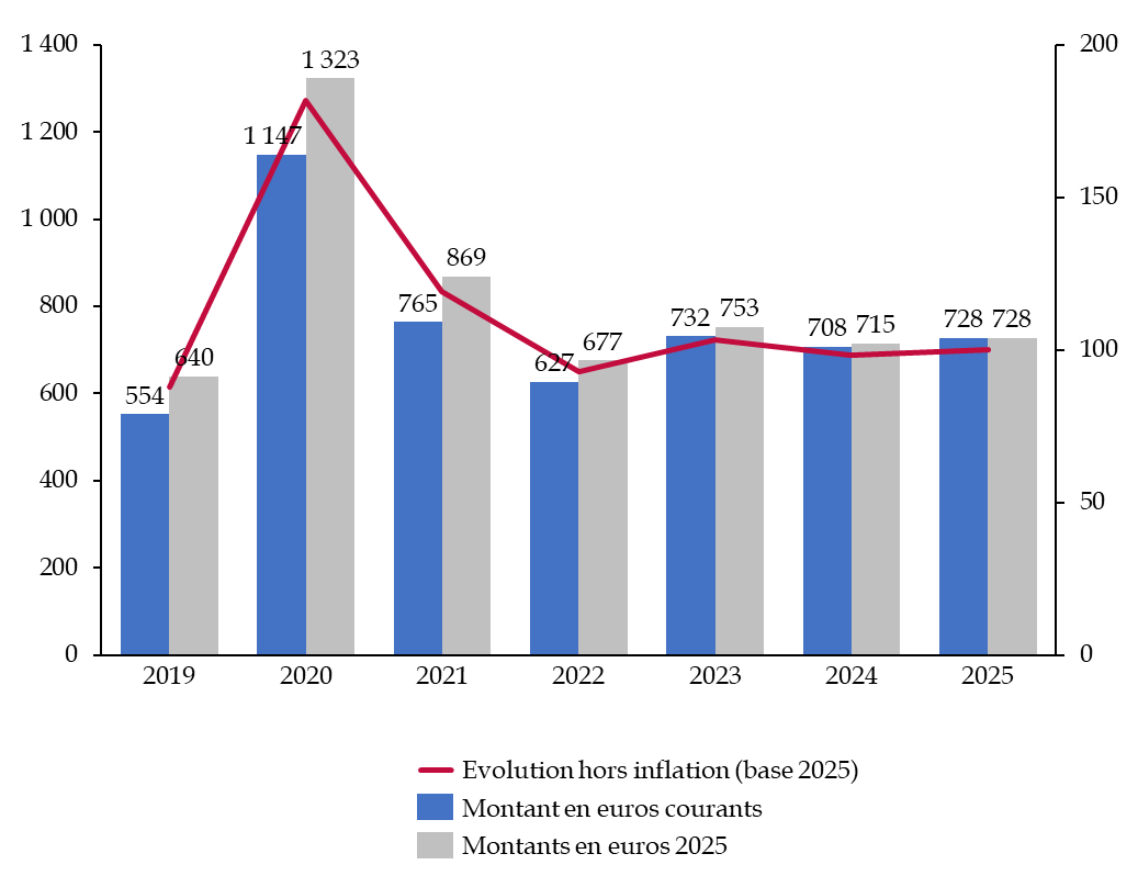 On constate donc un recul de la mission en euros courants après plusieurs années de hausse depuis la fin de la crise sanitaire. Par rapport à 2019, dernière année antérieure à la pandémie, les crédits de la mission ont augmenté de 114 millions d'euros en CP, soit une hausse de 20 %.