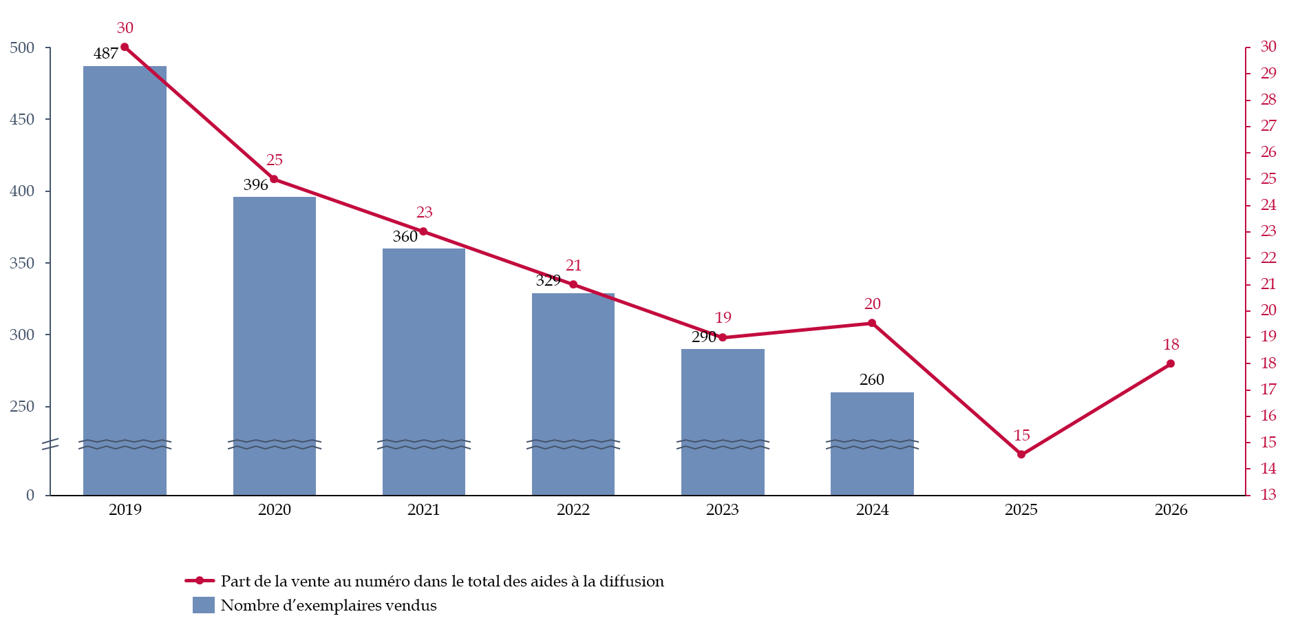 Le montant total des aides à la presse écrite devrait atteindre 178,29 millions d'euros en 2026. Il est donc en diminution par rapport à l'année précédente (- 5,8 %). Il convient de noter que s'ajoutent aux dépenses budgétaires en faveur de la presse 65 millions d'euros de dépenses fiscales (dont 58 millions d'euros pour le seul taux de TVA « super réduit » sur la presse).