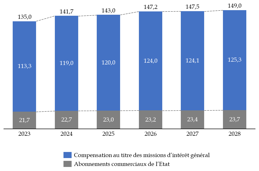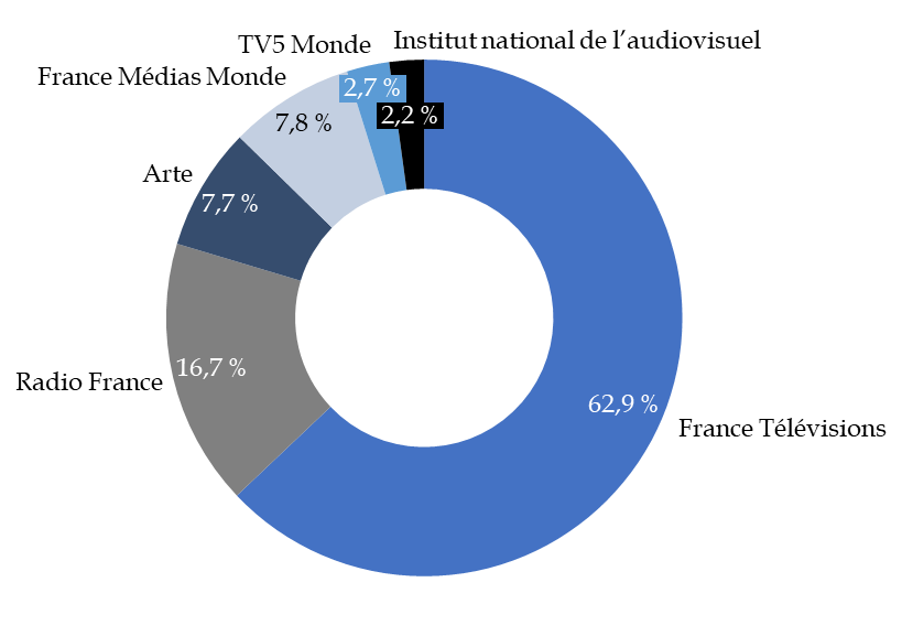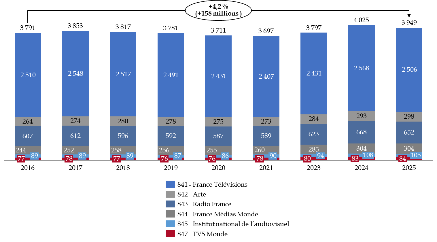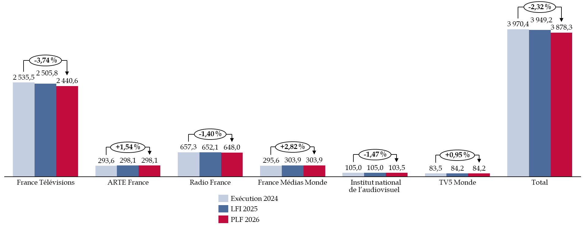 Le projet de loi de finances prévoit que les sociétés de l'audiovisuel public bénéficient en 2026 d'un montant de 3,878 milliards d'euros, bénéficiant pour près des deux-tiers à France Télévisions et pour 17 % à Radio France. Le montant prévu en 2026 serait inférieur d'1,8 % au montant accordé en 2025.