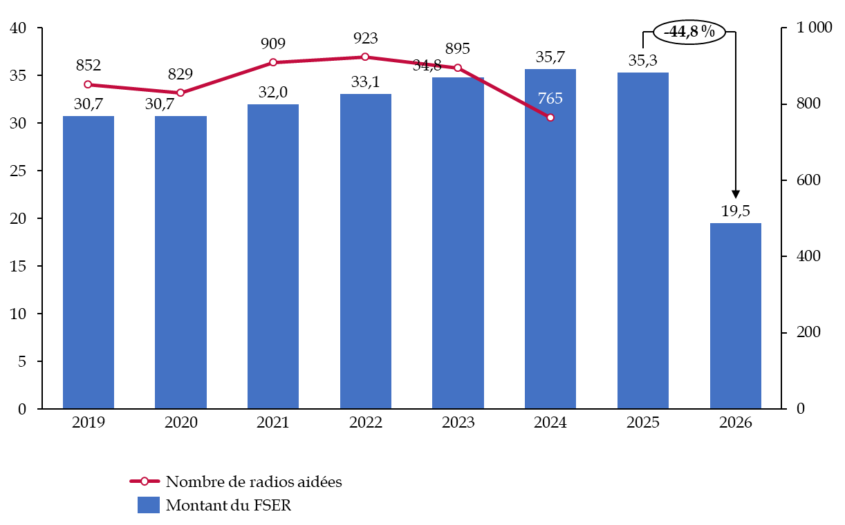 Les crédits du Fonds de soutien à l'expression radiophonique (FSER) devraient être quasiment divisés par deux en 2026, pour atteindre 19,5 millions d'euros. Les radios associatives sont des acteurs essentiels pour la vitalité des territoires. Il est regrettable que la situation budgétaire contraigne à réduire leurs marges de manoeuvre. Le rapporteur spécial appelle donc le Gouvernement à revenir en gestion sur cette diminution, par redéploiement d'autres programmes et d'autres missions du périmètre du ministère de la culture.
